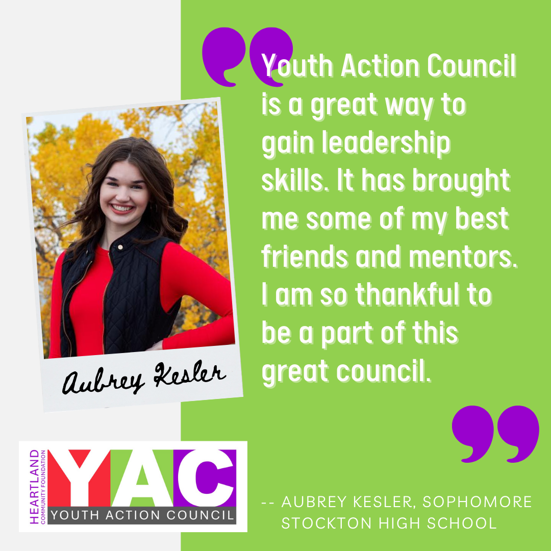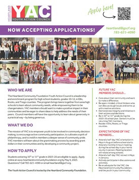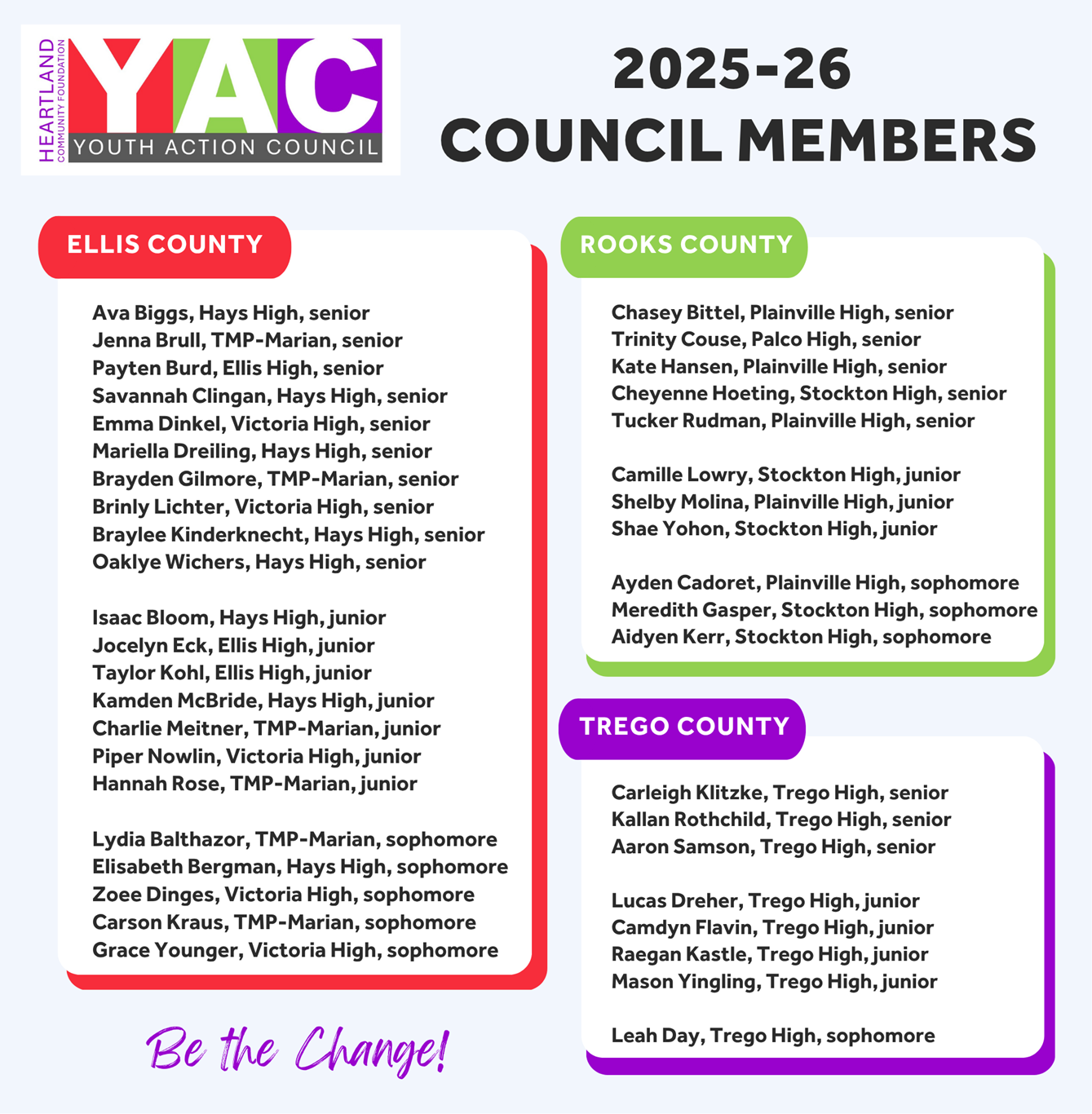 The Heartland Community Foundation Youth Action Council is a leadership and enrichment program for high school students, grades 10-12, in Ellis, Rooks, and Trego counties. The program brings teens together from area high schools to learn about community needs, while empowering them to be change makers. YAC members should want to make a positive impact in their communities and be eager to share ideas to help address the needs of their peers. Council members will have the opportunity to learn about generosity in a practical way – by being generous.